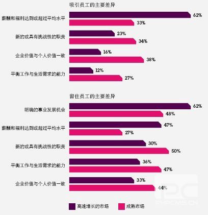 随着企业向新的地区增加人力投资,它们需要认识到在这些区域吸引和留住所需人才的差异。IBM的调研指出,已经在这些区域内运作的企业对如何吸引和留住人才已经有所了解,而对新进入者而言,如何吸引和留住人才可能意味着挑战。