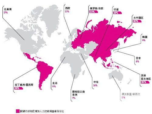 但这并不是单向迁移。不仅成熟市场中的企业将在高速发展的市场中投资以增加人力,而且新兴市场中的企业也将继续拓展海外市场,并成为世界舞台上有力的竞争对手。例如,在高速增长的市场中,34% 的首席人力资源官称,他们预计将在未来3年内在北美洲增加人力,而37%的首席人力资源官计划在西欧进行额外的投资。这包括印度的企业,其中45%的被调查者指出,他们计划在北美洲增加人力,而44%的被调查者表示将在西欧增加人力。在中国,我们调查的33% 的首席人力资源官称,他们计划在北美洲增加人力,而14%的人表示将在西欧增加人力。