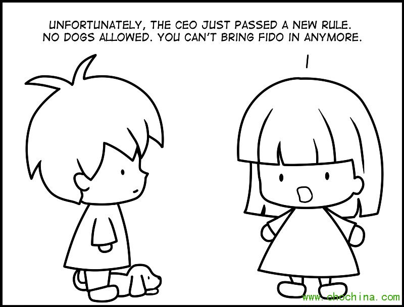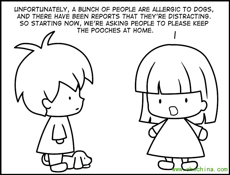 牛逼管理者:坏消息,不少同事对狗过敏,而且报告反馈这使他们工作分心,所以从现在开始,我们不能带狗狗来上班了