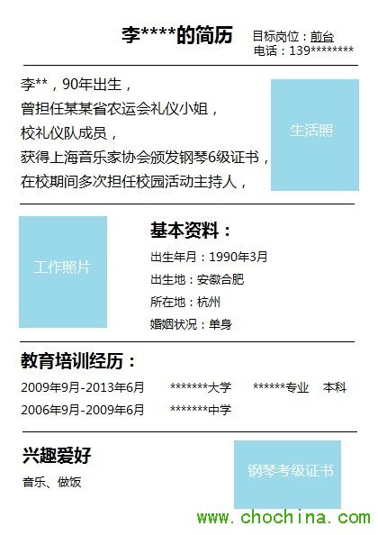 曾经有位小伙伴刚毕业,想去某企业应聘前台岗位,问我怎么写简历。我先告诉她,前台是离企业最近的窗口,过了前台就进入企业内部了,每个企业都希望通过前台来传递企业形象和企业文化,最末流的企业也希望物色到一流的前台,明眼人一想就知道,前台需要气质好、形象佳、声音甜美、美丽大方懂礼仪的菇凉。再问她怎么证明她具备这些条件。她跟我说了很多,我帮她提炼了一下,最后她编制的简历如下图: