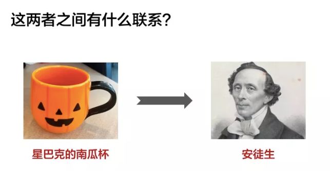 这是一个由事物A(南瓜杯)直接跳跃到事物B(安徒生)的例子。但是,这两者之间的内在联系是什么呢?