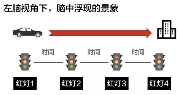 例如早上上班时,百无聊赖的我在等红灯,前面的车大排长队。这时我估算了一下剩下路程中,还有几个红灯需要等待,每个红灯大概会花费多久时间,那么我就能计算出到达公司是几点钟。此时,我开启的是左脑视角(如下图):