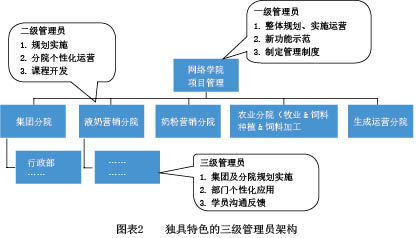 辉山网络学院囊括集团及五大事业部共3000多名员工,在管控上若靠项目负责人单兵作战是不够的,需要团结更多人参与到项目中,贡献想法和力量。因此,辉山网络学院精心搭建了独具特色的三级管理员架构,其中,各级管理员是核心运营团队,承担着整体日常运营和组织工作,是网络学院运营的有力保障(见图表2)。