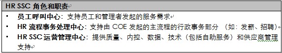 HR流程事务处理中心:支持由COE发起的主流程的行政事务部分 (如:发薪、招聘)