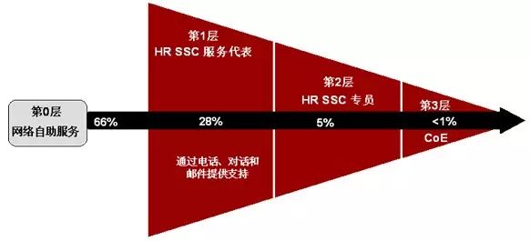 第0层-网络自助服务:在这一层,管理者和员工,通过网页自助服务解答HR问题和完成HR事务处理;基于领先实践,在这一层通常可以处理66%的问题;