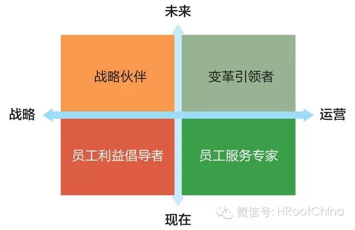 自Dave Urich1997年出版那本带给人力资源界革命性影响的《人力资源优胜者Human Resources Champions》以来,人力资源应该成为企业战略伙伴的理论像一支灯塔照亮了一直以来俯首甘为孺子牛的HR们。作为辅助部门,HR似乎找到了昂首挺胸与业务部门平等对话的理论依据。一时间,四个象限定位理论(见下图)被人力资源界热捧,它如同新思维的春风从尤先生的老家美国吹到欧洲、亚洲,作为理论的落地,HR的组织架构和业务重心也随之调整。